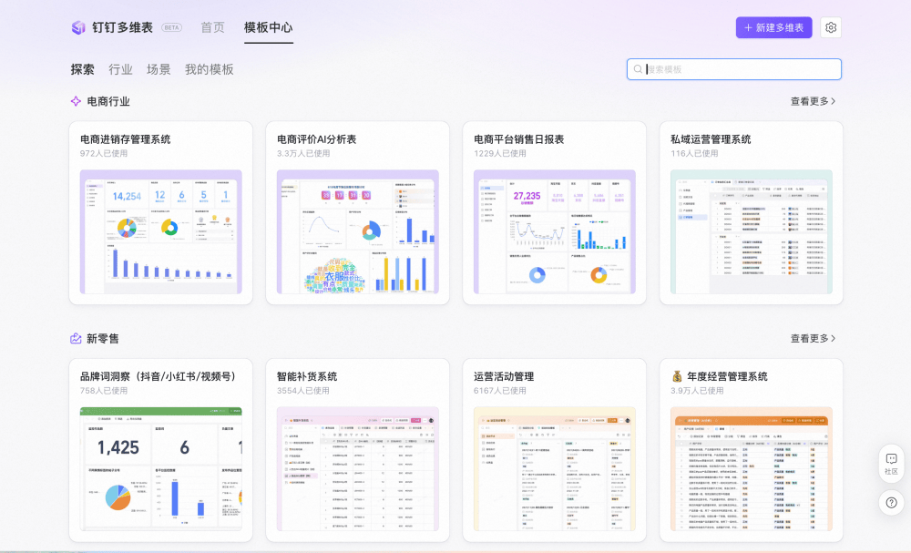 多维表作为一种新型的表格协作方式,以灵活配置、高效数据分析的数据表为核心优势,支持用户、企业用一张表管好业务。除面向电商等行业打造好用的模板外,钉钉多维表也正在加速丰富可接入的数据源、AI 字段、自动化工作流等能力,用多维表+AI 为企业带来更低门槛、低成本的业务系统。