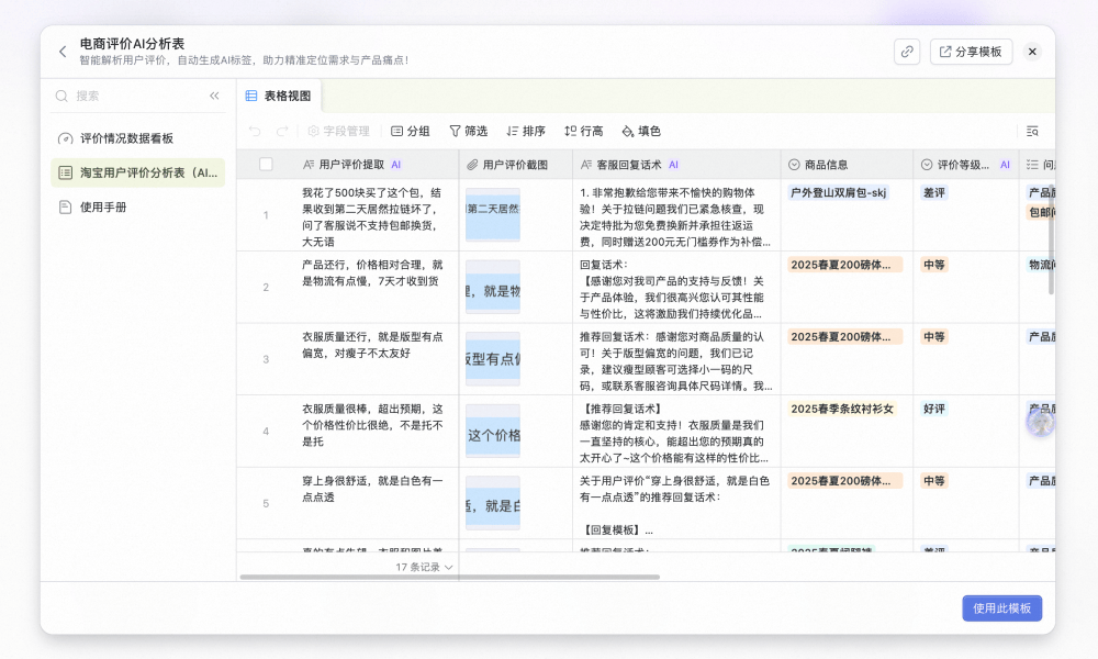 使用钉钉多维表后,第三方的 RPA 工具每天会将淘宝、天猫、抖音、小红书等平台的商品评价数据,自动采集更新到多维表中,多维表的 AI 模板会对海量的消费者评价完成整理,将负面、中性、正面评论分门别类,10 分钟就可以完成数据分析。针对差评,客服人员还可以利用 AI 生成客服回复建议。